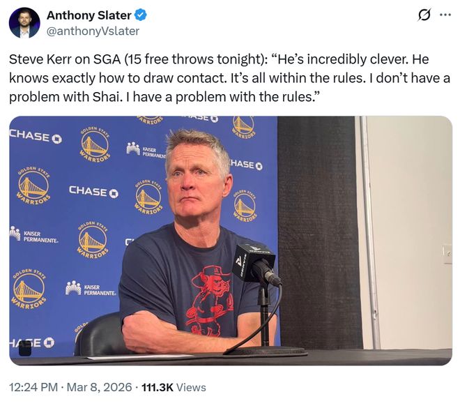 雷霆常规赛4-0横扫勇士成西部唯一!SGA狂造15次罚球砍27+5+5惹争议,科尔公开表达对于吹罚规则的不满,哈登意外遭点名躺枪。