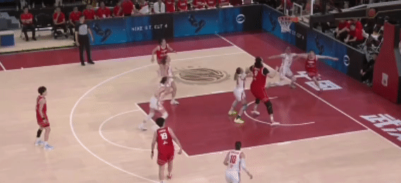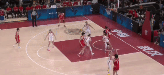 第四节:李星诺也出战,寻找感觉。中国女篮大比分领先,保持球员的热身状态。唐子婷给到刘禹彤,后者一个很轻松的节奏变化得分: