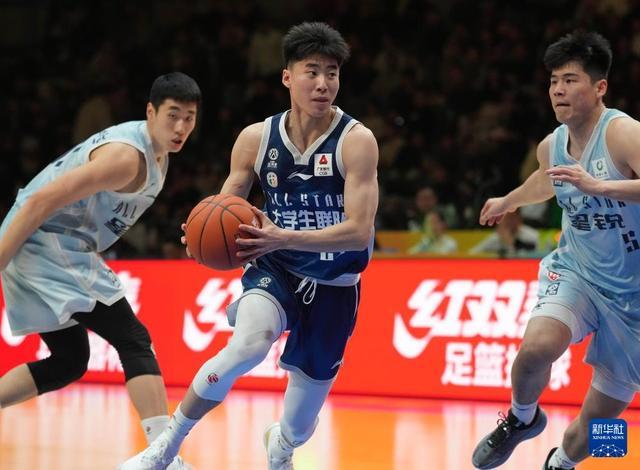 3月7日,大学生联队球员曹芷豪(中)在比赛中突破。新华社记者 孟永民 摄