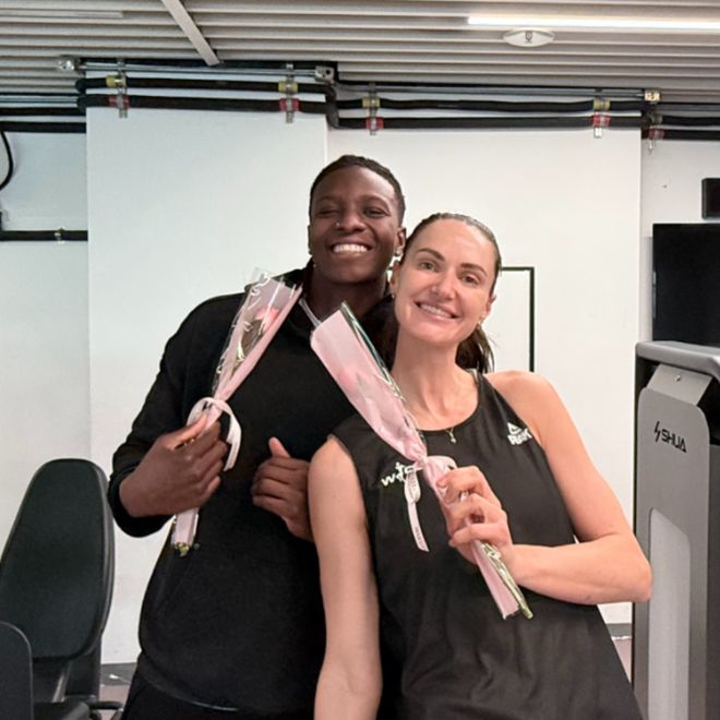 另一边,俱乐部杯赛区训练场里,北京首钢园女篮主教练李翔也将鲜花送到了女篮姑娘们手中。