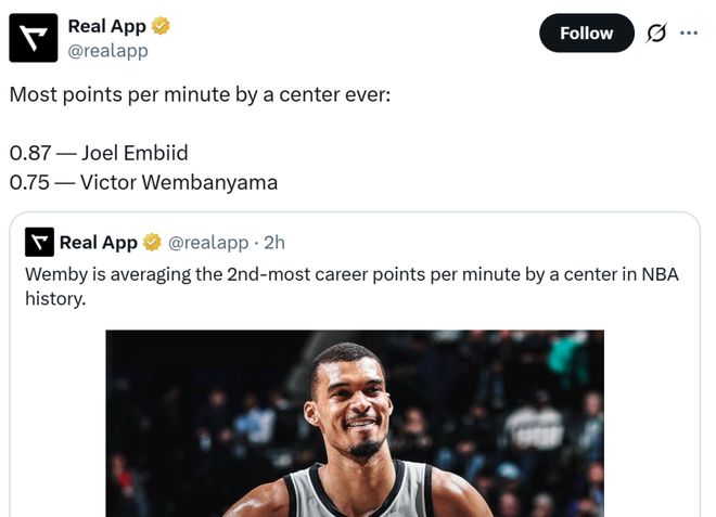 并且文班亚马这样的表现并非是灵光一闪,生涯至今,文班每分钟可以拿到0.75分,高居NBA历史第二,仅次于恩比德的0.87分。
