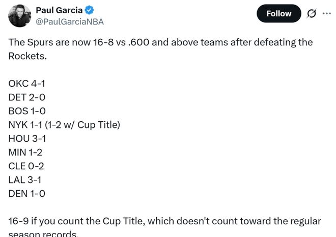 本场击败火箭队之后,马刺队本赛季对阵胜率至少60%的前十强队时豪取16胜8负傲人战绩(扣除杯赛决赛),对阵联盟第一的雷霆4胜1负,对阵火箭与湖人两队均为3胜1负。