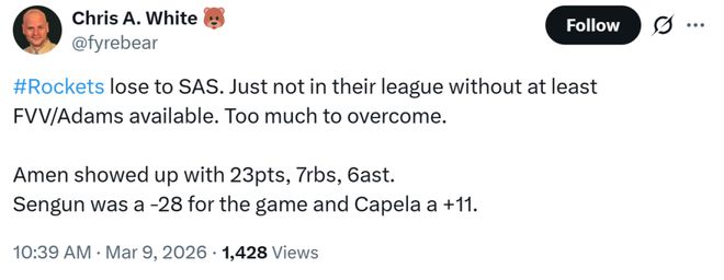 连火记Chris A. White都不禁感叹,在缺少范乔丹与亚当斯的情况下,火箭队根本就不是这支马刺的对手,双方实力差距巨大。